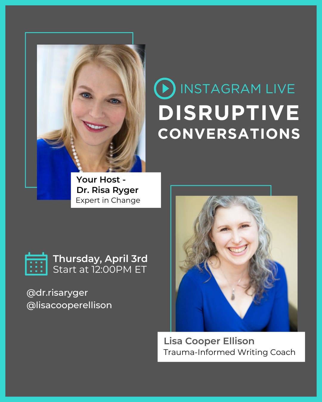 Join me at 12:00 PM ET for this FREE Instagram live on 4/3 where I’ll have a disruptive conversation with Dr. Risa Ryger!